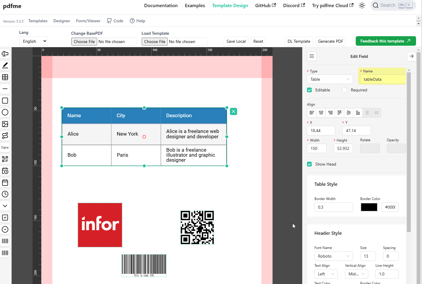 Use PDFme’s template editor to generate a layout. Set relevant field names for your fields!